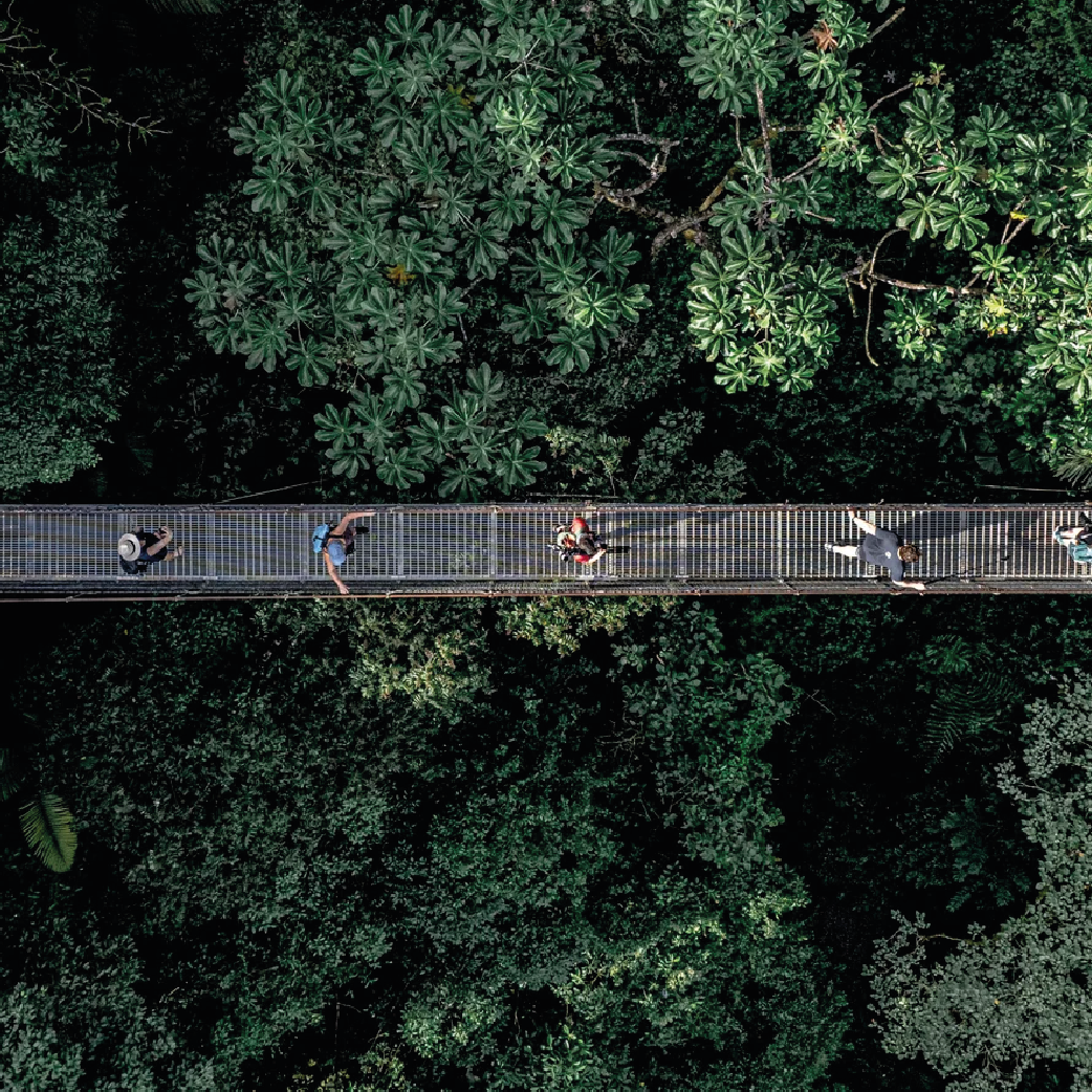 CONTINUE YOUR ADVENTURE AT MISTICO PARK, WALKING ALONG THE ICONIC HANGING BRIDGES THAT BRING YOU CLOSE TO THE RICH BIODIVERSITY OF THE JUNGLE. FINALLY, RELAX IN A NATURAL THERMAL RIVER AND INDULGE IN A VOLCANIC MUD EXFOLIATING MASK—A PERFECT WAY TO REJUVENATE AFTER A DAY OF EXPLORATION.